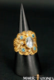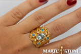 Inside the ring lies an aquamarine stone surrounded by 4 blue topaz stones.which give the ring it's distinctive and luxury design.